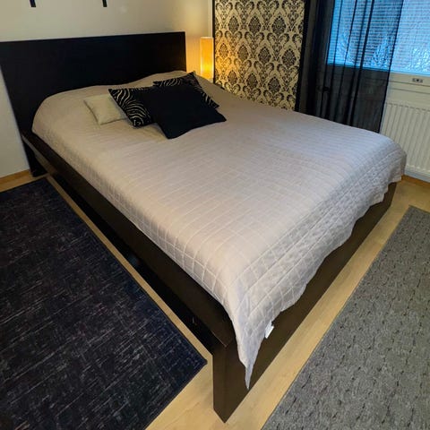 Myydään 160cm leveä ikean Brimnes sänky. 4 ala laatikkoa ja pääty säilytystilalla/hyllyillä. Sälepohja mukaan. Sänky on kokenut monta muuttoa joten jälkiä varmasti löytyy. Yleisilmeeltään kuitenkin siisti ja tukeva. Pahin jälki on päädyn tason päällä mihin on joskus kaatunut vesilasi niin maali on kupruillut pois, helppo piilottaa/korjata . Jos ehdin voin maalata päädyn tason valmiiksi. Kuva ikean sivuilta, sieltä löydät tarkat mitat myös. Sunnuntaina saan lisää kuvia halukkaille.