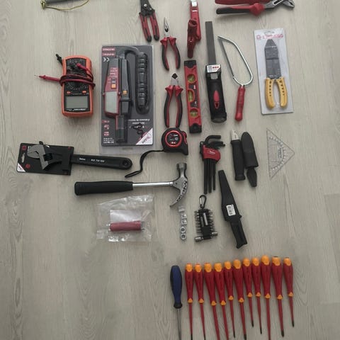Työkalusarja sisältää erilaisia sähköasentajan työkaluja, kuten pihdit, ruuvimeisselit, vasaran, mittalaitteen ja vesivaa'an. Sarja soveltuu sähköasennuksiin ja korjaustöihin.