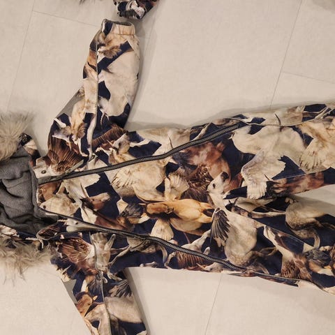 Meille uutena ostettu, kahden lapsen käyttämä. Muutoin hyvässä kunnossa, ehjä ja siisti, mutta heijastimissa hiukan kulumaa, etenkin toisen lahkeen, katso kaikki kuvat.