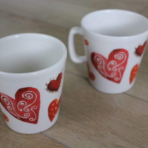 Lahjapakkauksessa oleva sydänvuoka ja kaksi mukia