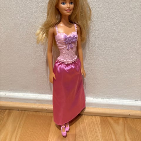 Barbie lasten lelu nukke, vaaleat hiukset ja vaaleanpunainen mekko.