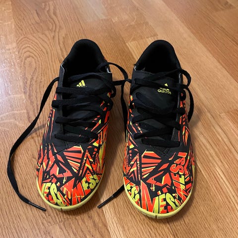 Adidas Messi jalkapallokengät hopeanharmaalla ja sinisellä värityksellä. Koko 32