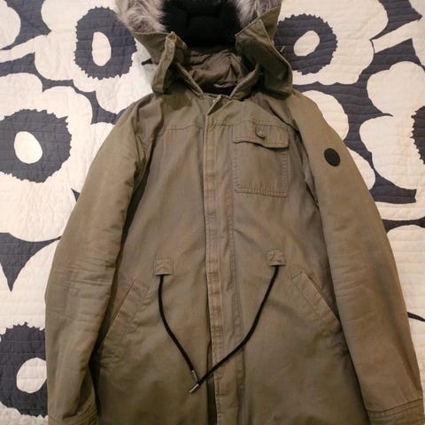 STC DNM parkatakki, koko reilu M. Lämmin, päälikangas vahvaa puuvillaa, vanuvuori, vyötärökiristys nyöri.