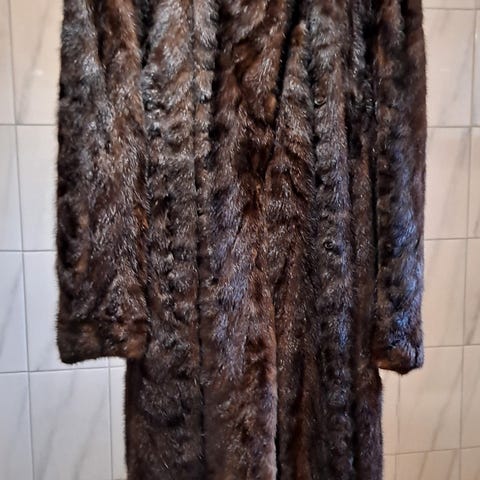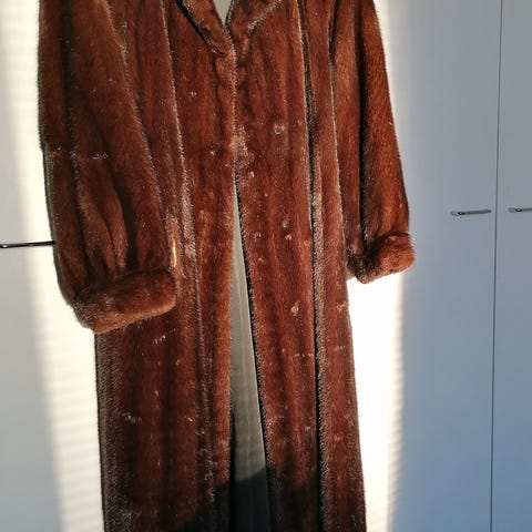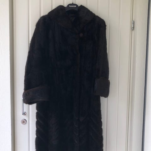 Ruskea turkis naisten takki, koko L. Valmistettu minkkiturkismateriaalista, suunniteltu naisille. Takki tarjoaa lämpöä ja suojaa kylmiltä säiltä.