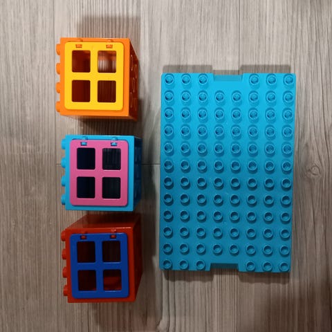 Kaksi Duplo-mökkeröisosaa eli koppi jossa aukeava ovi sekä leikin paremmin mahdollistava avoin tausta. Eri väriset ja ovet hieman eri malliset. Leikin jälkiä näkyvissä.