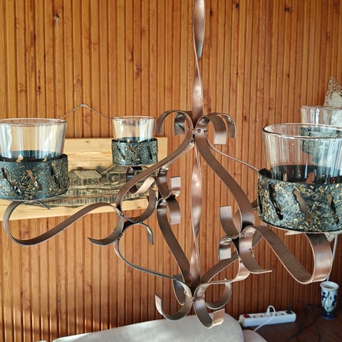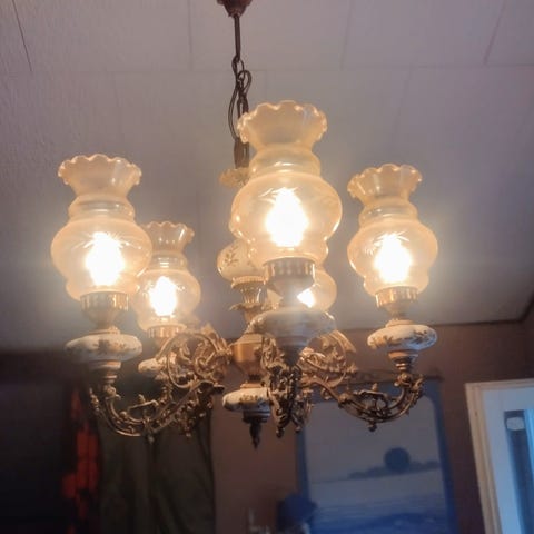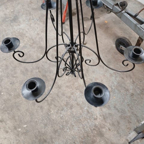 Kaunis kynttilä kattokruunu, yhdestä sarakkeesta kynttilän pesä irronnut.