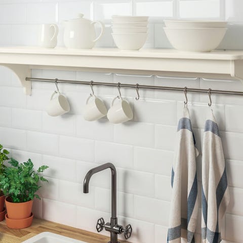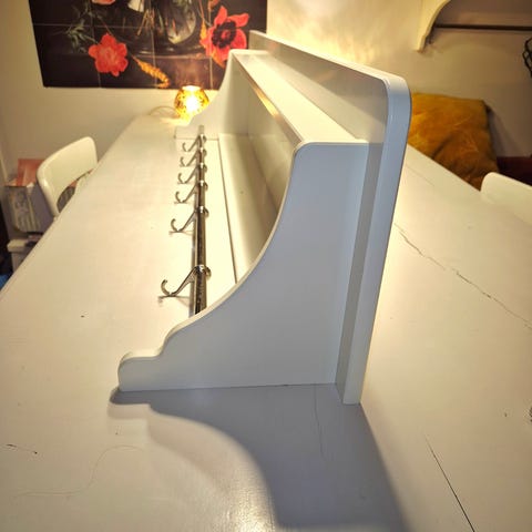 Kaunis valkoinen seinähylly, sopii lautasten, kuppien ja keittiötarvikkeiden esillepanoon tai säilytykseen.