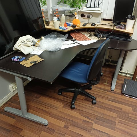 Annetaan työpöytä (jotain käytön jälkeä on). Marmorinen dcfix kannen päällä. Vedettävä laatikko. Annetaan siinä kunnossa kun nyt on eli en ala pyyhkimään ja puunaamaan.