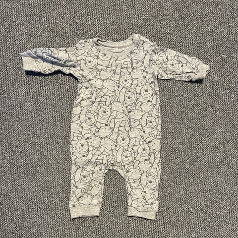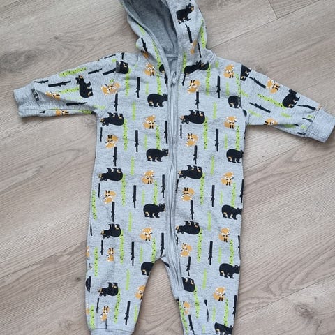 Harmaa hupullinen kollariasu koossa 62/68. Edessä vetoketju ja muutama neppari. Hyvä käytetty kunto.
