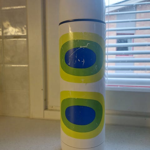 Marimekko pullo, jossa oranssi väri ja kuvioitu muotoilu. Pullossa on musta korkki ja puinen kantohihna.. pitää juomat kylmänä tai kuumana pitkään. Nouto, toridiili, posti