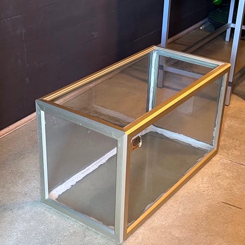 Terraariokäytössä ollut akvaario. Kansi puuttuu.
