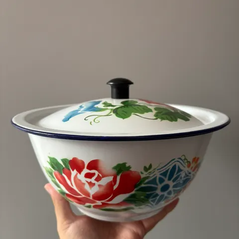 Kaksi samanlaista, mutta erikokoista emalikulhoa. Isomman korkeus n. 7,4 cm ja suuaukon halkaisija n. 18 cm. Pienemmän korkeus n. 7 cm ja suuaukon halkaisija n. 16,3 cm.