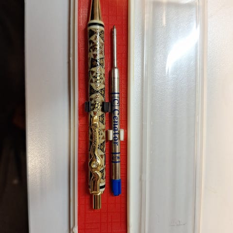 Kynässä lukee "HYVÄÄ uutta vuottai". Tarjoa tai kerro enemmän jos tiedät alkuperästä jotain.