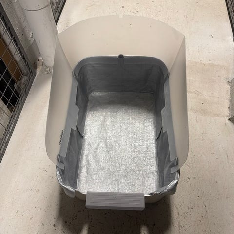 Mukaan ei tule alkuperäispakkauksessa olevaa lapiota eikä hiekka-roskapussia. Pussit ostettavissa erikseen. Toki vessaa voi käyttää ilman pussejakin, jos haluaa.