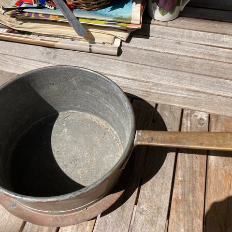 Vanha käsintehty kuparimuki, antiikkia. 1900-luvun alkupuolelta, korkeus 7 cm. Tinattu sisältä. Komea vanha kuparimuki, jossa menneet vuosikymmenet näkyvät.