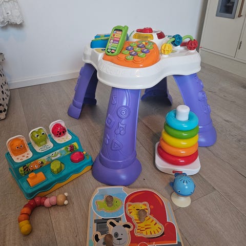 Fisher-Price Aktiviteettipöytä lasten leluille, jossa on useita värikkäitä leikkitoimintoja. Pöydän jalat ovat siniset ja pöytä on valmistettu kestävästä muovista. Sopii lapsille motoristen taitojen harjoitteluun ja viihdyttämiseen.