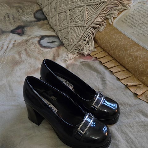 Vaaleanpunaiset lolita-tyyliset saappaat. Toisen saappaan sivussa pieni vaaleansininen läikkä. Koko 36.