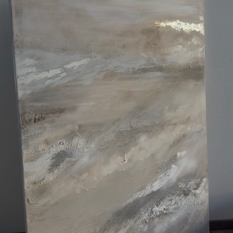 Maalaus, jossa on nainen valkoisessa mekossa katsomassa kaukaisuuteen. Teos on luonnosmaisella, pehmeällä tyylillä toteutettu ja sen värit ovat pääasiassa beigen, sävyjä ja valkoista.