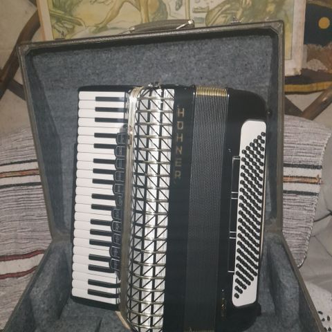 Hohner Accordion Verdi Vn (120 bassoa) jossa on musta runko ja valkoiset koskettimet. Sopii erilaisiin musiikkityyleihin ja soittoharjoituksiin. Mukana myös säilytyslaatikko.