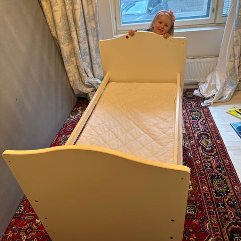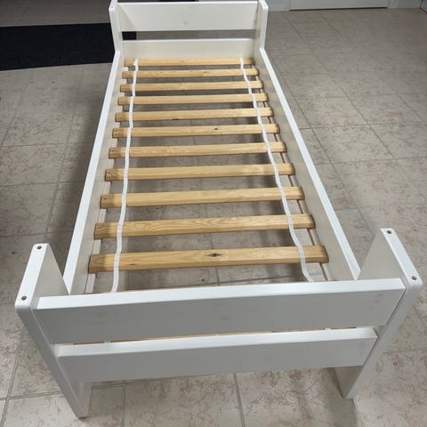 Lasten yhden hengen sänky valmistettu puusta, jossa on vaalea runko ja tummemmat puuosat päädyissä. Pienimmillään sänkyyn mahtuu noin 80cm x 120cm patja ja pisimmillään sänkyyn mahtuu 80cm x 200cm patja. Sängyssä puusälepohja.