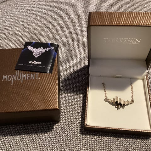 Ilpo Tarkkasen Monument hopeinen kaulakoru,vaikka lahjaksi on käyttämätön ja paketissaan.voin myös postittaa