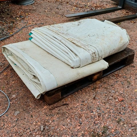 Kuvan muotoinen paksu ja kestävä pressu. Ei reikiä noin 84 neliötä.