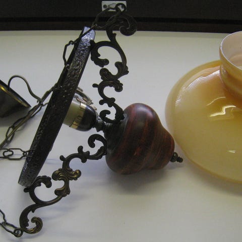 Metallia ja lasia. Ruskea kanta, valkoinen kuupa, kuupassa pieniä lommoja ja naarmuja. Keltainen lasinen lieriöydin moitteeton. 3. ruuvi ei ole alkuperäinen. Korkeus 24cm, leveys 40cm, ruskean kannan leveys 13cm, lasiputkilieriön halkaisija 14cm. Nouto Tampereen Tammelasta.