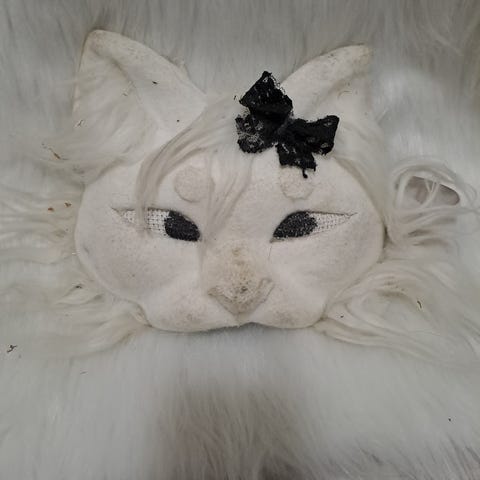 Käsintehty Therian-naamio, joka esittää kissan kasvoja mustavalkoisin ja punaisin yksityiskohdin. Naamiossa on kiinnityshihna.