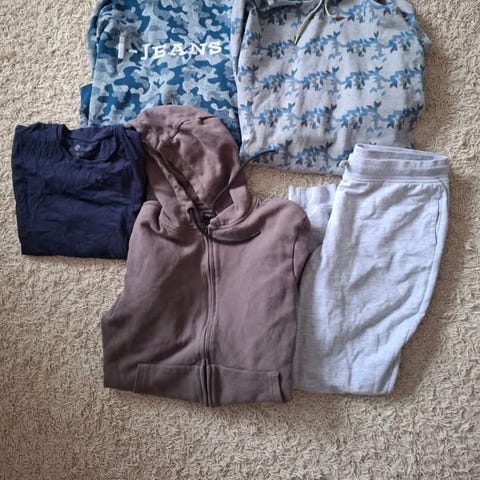 Myytävänä M koon miesten vaatepaketti, johon kuuluu kaksi hupparia, sekä uudet housut ja uusi t-paita