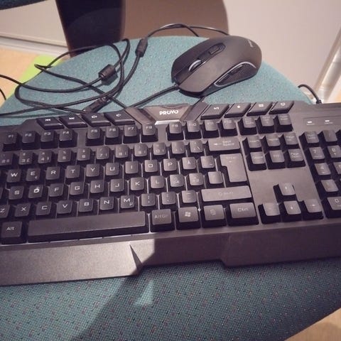 Provo näppäimistö ja hiiri musta. Näppäimistössä näkyy käytön jälkiä, kuten kulumaa näppäimissä. Mukana myös Provo kuulokkeet. Vain nouto