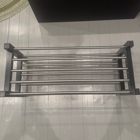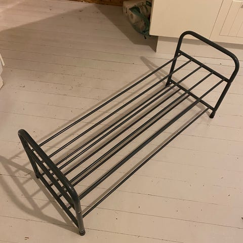 Tukeva kenkäteline, metalliputkirakenne.