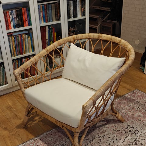 Ikean nojatuoli, istuin- ja selkänoja rottinkia ja runko metallia. Kevyt siirrellä. Vain nouto.
