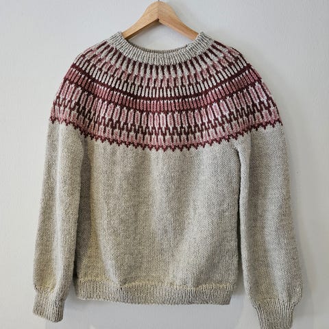 Kirjoneuleen malli on islantilaisneule Juutua, lankavalinta vaihdettu paksummaksi.