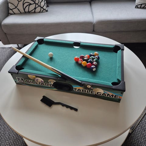 Jäänyt kaappiin kun pöytä myyty. Kooltaan vähän virallisia pienemmät, mutt hyvät pelit näillä saa esim 0,8 m * 1,2 m kokoisella pöydällä. Muistelen, että ollut sitä kokoa.. pöytä.
