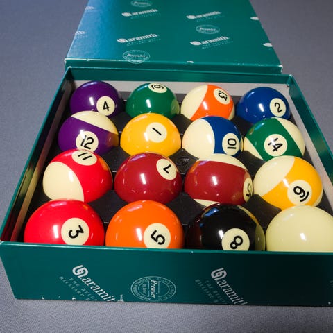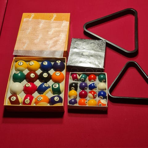 Biljardipallot eri väreissä ja numeroissa, mukana musta teline pallojen järjestämiseen.