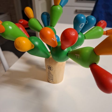 Tuolien pinoamispeli 3+. Pelaajien määrä 1-4. Pelaajat rakentavat tornin pinoamalla tuoleja päällekkäin. Ensimmäinen henkilö, joka asettaa oman värinsä mukaiset tuolit pinoon, voittaa. Sisältää: 18 pientä tuolia. Tuolit erinomaisessa kunnossa. Laatikon yläossassa hieman taitto jälkeä. Kissatalous.