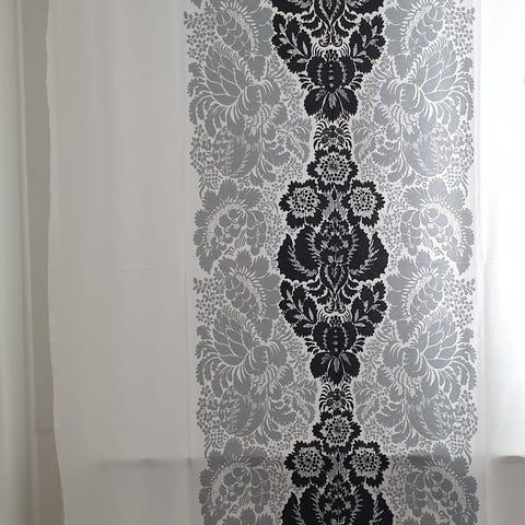Marimekon kankaasta itse ommeltu jouluverho. Väri kuvata poiketen tumman punainen. Korkeus 42,5 cm ja pituus 275 cm. Ollut muutamana jouluna ikkunassa.
