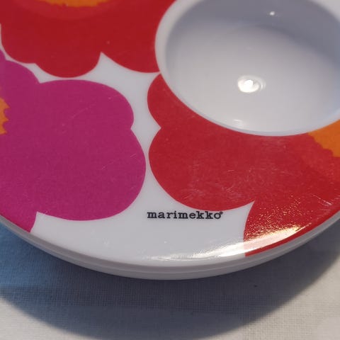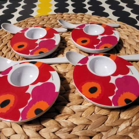 Punaiset Marimekon Unikko munakupit ja lusikat alkuperäispaketissa, kaksi munakuppia ja lusikkaa.