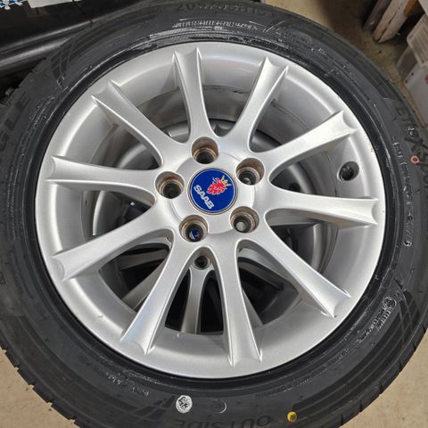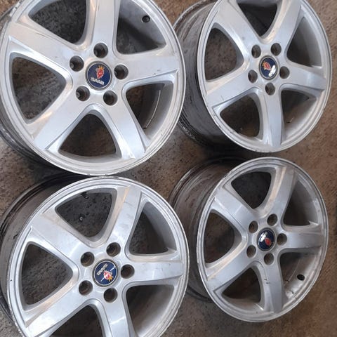 Saab 9-5 Aero alkuperäiset aluvanteet, ikäisekseen hyvät ja siistit, suorat ei täristä tms. Jonkun verran ajan tuomaa kulumaa, ei pahemmin kanttarinaarmuja, paikoittain maali vähäsen hilseilyt, katso kuvista. Kitkarenkaat Kumho 225/50, pintaa on hyvin, katso kuvista.