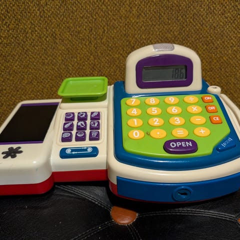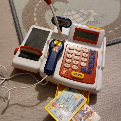 Mukaan tulee myös pieni kori jossa leikkihedelmiä. Ei varmuutta mikrofonin/ näytön toimivuudesta. En testannut uusilla paristoilla. Myynnissä myös muualla.