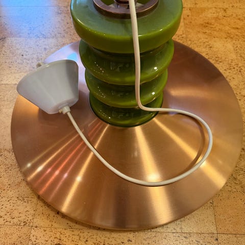 Riippuvalaisin, jossa messinkinen runko ja kaksi valaisinta. Valaisimissa valkoiset varjostimet. Korkeutta voi säätää sopivaksi ketjun avulla. Mitat leveys 52 cm ja kiinteän osan korkeus 32 cm, lasivarjostien halkaisija noin 17 cm.