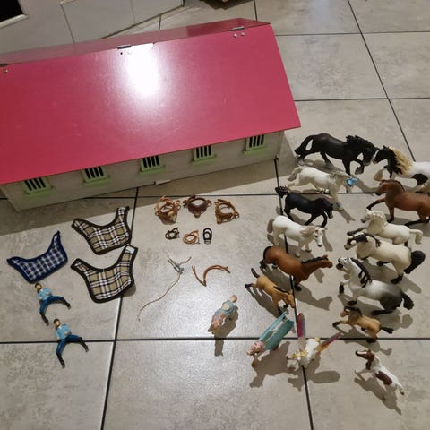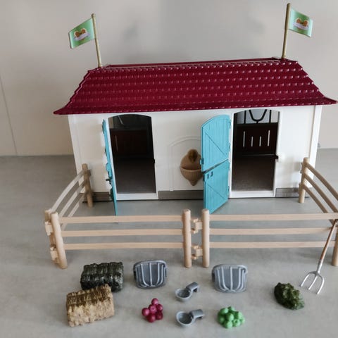 Itse tehty schleich tallialue. Sisältää 8 karsintaa, 3 tarhaa, varustehuoneem, pesupaikan, kentän esteillä, ruokaa ja hevosenhoitotarvikkeita.