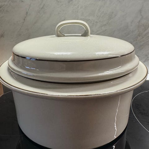 Arabia Fennica kannellinen uunipata. Design Richard Lindh. Ulkomitta 23 cm, sisämitta 19 cm. Korkeus ilman kantta 7.5 cm ja kannen kanssa 13 cm. Kunto moitteeton.