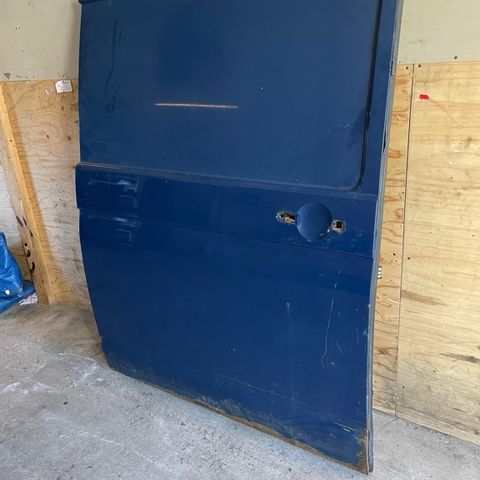 Volkswagen auton ovi sinisenä. Ovi on käytetty ja siinä on näkyviä kolhuja ja naarmuja. Lukon kahva on puuttuva.