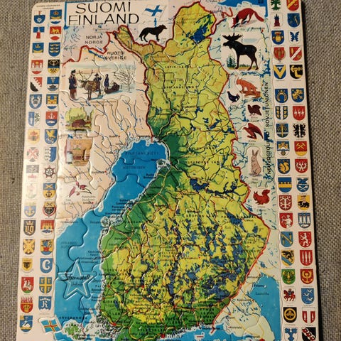Suomenkartta palapeli 80 luvulta. Kork. 36,3 cm. Lev. 28,5 cm.
