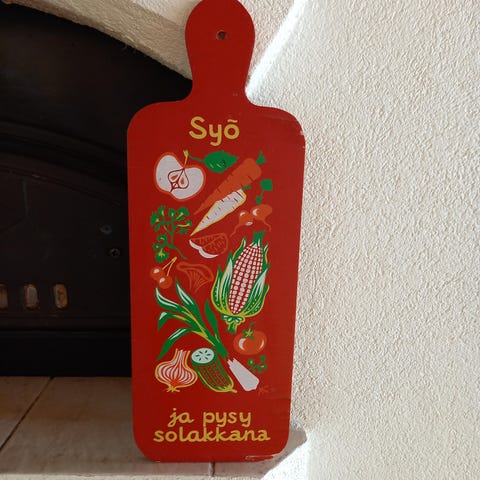 Arviolta 80-luvun Neuvostoliitosta peräisin oleva koriste-esine. Käytetty jäljistä päätellen ennen leikkuulautana, mutta ei kelpaa enää siihen tarkoitukseen. Taustaväri punainen/oranssi. Laudan koko 31 x 25 cm.