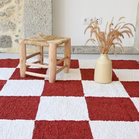 Avainsanat: ruudullinen matto, käsinkudottu matto, punainen matto, shakkiruutu, kierrätyspuuvilla, ekologinen matto, pehmeä matto