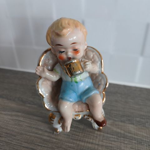 Keraaminen koristefiguuri poika sinisellä paidalla