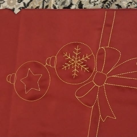 Jouluinen poppanaliina. Pituus 106cm. Leveys 35cm. Kuvassa näkyy haalea läiskä, jota en ole yrittänyt poistaa.