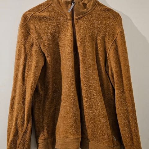 Half zip villafleece. Materiaali on sekoitus merinoa 60% ja tenceliä. Päälikangas teddymäinen ja vuori sileää pehmeää kangasta. Hihassa lankapako, joka pysynyt samassa mitassa pitkään. Oh 240. Materiaalilappu leikattu, mutta isää tietoa https://houdinisportswear.com/en-fi/clothing/sweaters-hoodies/womens-alto-half-zip-120234?color=120234G62